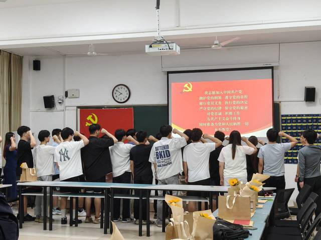 “我志愿加入中国共产党……” 在鲜红党旗前,毕业生党员与新发展党员队列整齐,高举右拳庄严宣誓,以铿锵誓言凝聚奋进力量。当 “为共产主义奋斗终身” 的誓言落下时,新党员李体昌说:“这是我第一次与学长们共同宣誓,他们的坚毅眼神让我读懂了党员的分量。” 仪式特意安排老党员领誓、新党员跟读的形式,让新、老党员们的声音在党旗下交融,凝成奋进的精神合力。