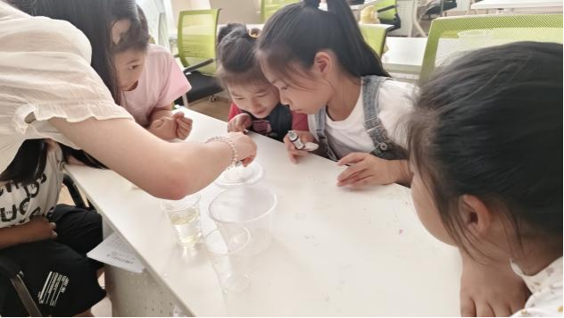 实践团又结合专业特色,开设“奇妙科学小课堂”,让孩子们在动手操作中感受科学魅力。在“流星雨实验”上,成员们用维生素B粉末模拟“星空坠落”,闪烁的金黄色光点让孩子们欢呼雀跃;“彩虹牛奶”实验中,洗洁精与食用色素在牛奶表面晕染出斑斓纹路,孩子们在观察中惊叹于化学反应的神奇;此外,“纸巾不湿的秘密”实验通过水杯倒扣演示气压原理。每场实验都以生活材料为载体,让科学原理变得可触可感。