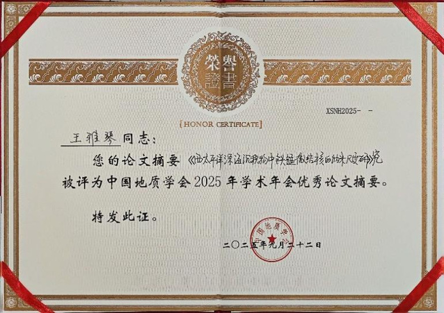 在这一高水平学术舞台上,我院2023级研究生王雅琴作了题为《西太平洋深海沉积物中铁锰微结核的纳米尺度研究》的口头报告。报告系统揭示了深海沉积物中铁锰微结核的内部结构、稀土元素富集机制及微结核生长过程,展示了纳米视角下的地球科学新认识。凭借研究的创新性与前沿性,该会议论文摘要被评为“中国地质学会2025年学术年会优秀论文摘要”。